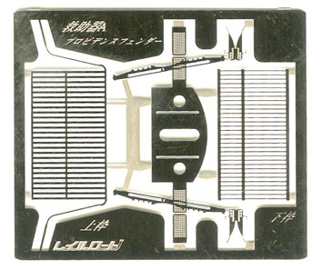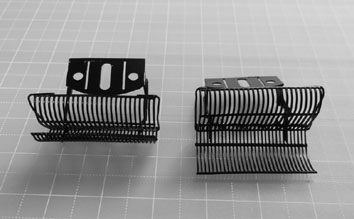 大正期の木造電車などに欠かせない救助器。阪急・阪神・京阪などの一部に使用のタイプ。ハンダ付けで組み立てます。右写真は組み立てた例で、折り曲げを加減することにより、下枠は上げた状態(後部)にも下げた状態(前部)にもなります。 |